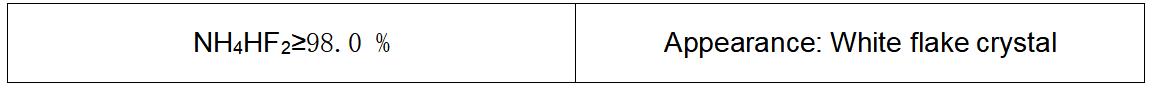 Ammonium bifluoride is produced by gas-phase production technology, which is formed by the direct reaction of hydrogen fluoride and ammonia. the product is a white flake crystal at room temperature, which has a certain degree of corrosiveness and toxicity. The company has introduced equipment and technology with international advanced level, and the product quality has reached the international first-class level, with a content of more than 98%. The products are mainly used in the production of electronic chemicals, and can also be used in chemical reagents, glass etchants, surface treatment agents, preservatives and other industries.